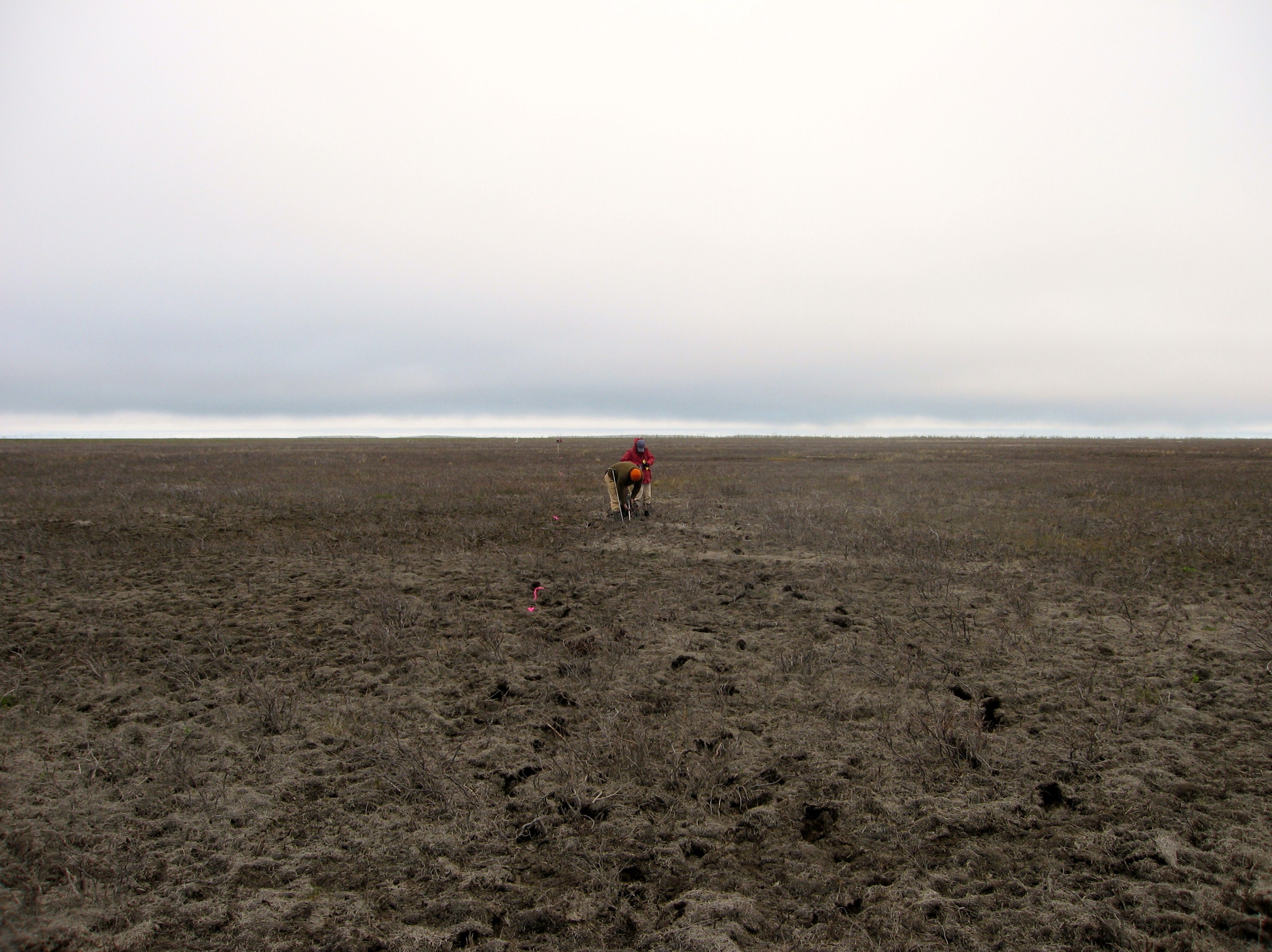 Sampling dead vegetation. A team of researchers conducting vegetation surveys in the impacted zone of the 1999 storm surge. Massive mortality of vegetation following the event can be observed over much of the NW Mackenzie Delta. Images courtesy of Trevor Lantz (University of Victoria). |