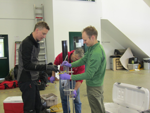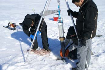 sediment core being collected through the ice. Photo credit: Jamie