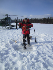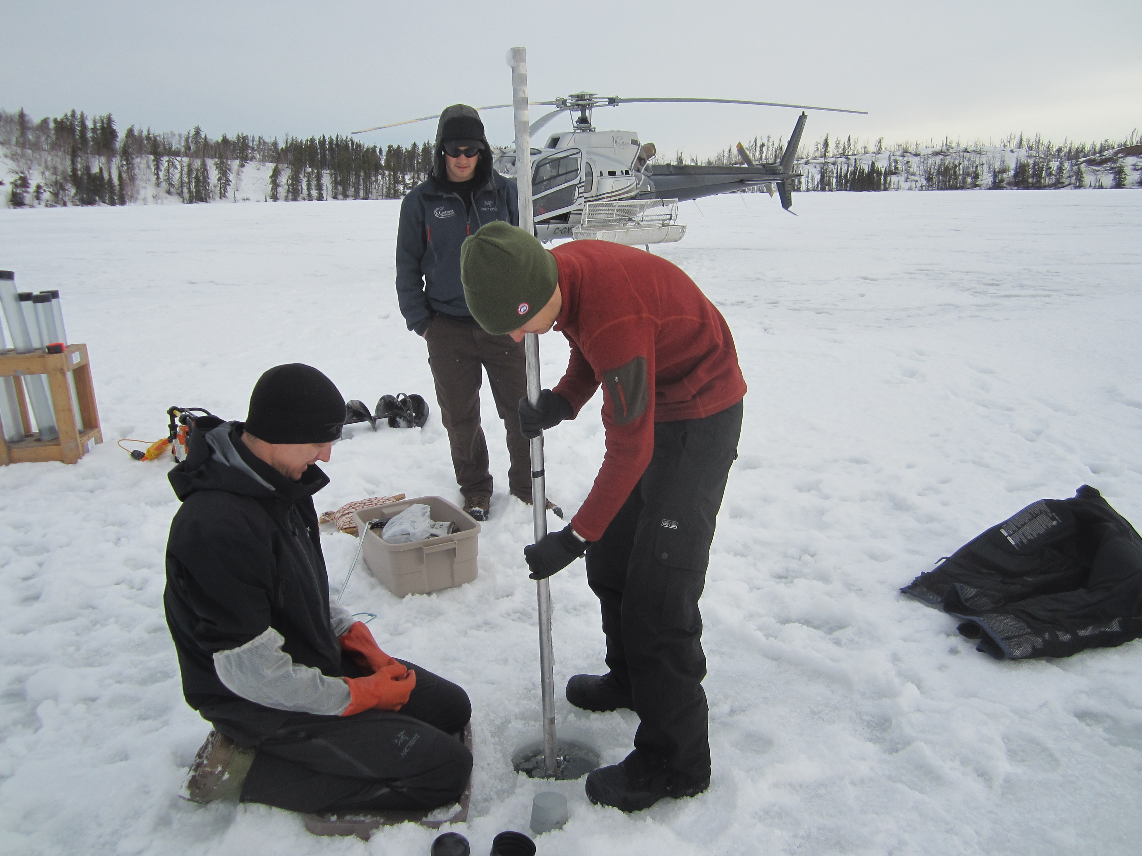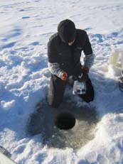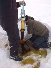 Collecting water samples through augered hole in ice-covered study lake.