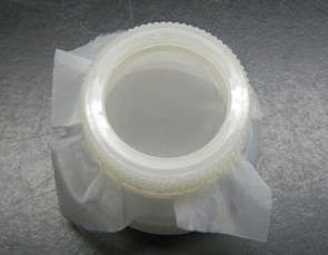 6. Next, transfer the sediments retained on the sieve into a small beaker using deionized water. To accomplish this, first concentrate the sediments in the center of the sieve. Unscrew the sieve, rinsing the edges of the modified Nalgene bottle (i.e. sieve) over the mesh. This ensures that all sediments are captured. Finally, rinse all sediments from the mesh into a small beaker. When you become proficient, the beaker should have ~20 mL of liquid in it. If you plan on leaving the sample for a few days, add several drops of 95% ethanol and cover with Parafilm®.