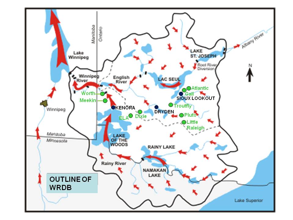 The eight selected lakes + ELA Lake 442 are located in the southern sub-watersheds of Winnipeg River and Lake of the Woods, and in the northern sub-watersheds of English River and Lac Seul and form a transect from west to east across the central WRDB.