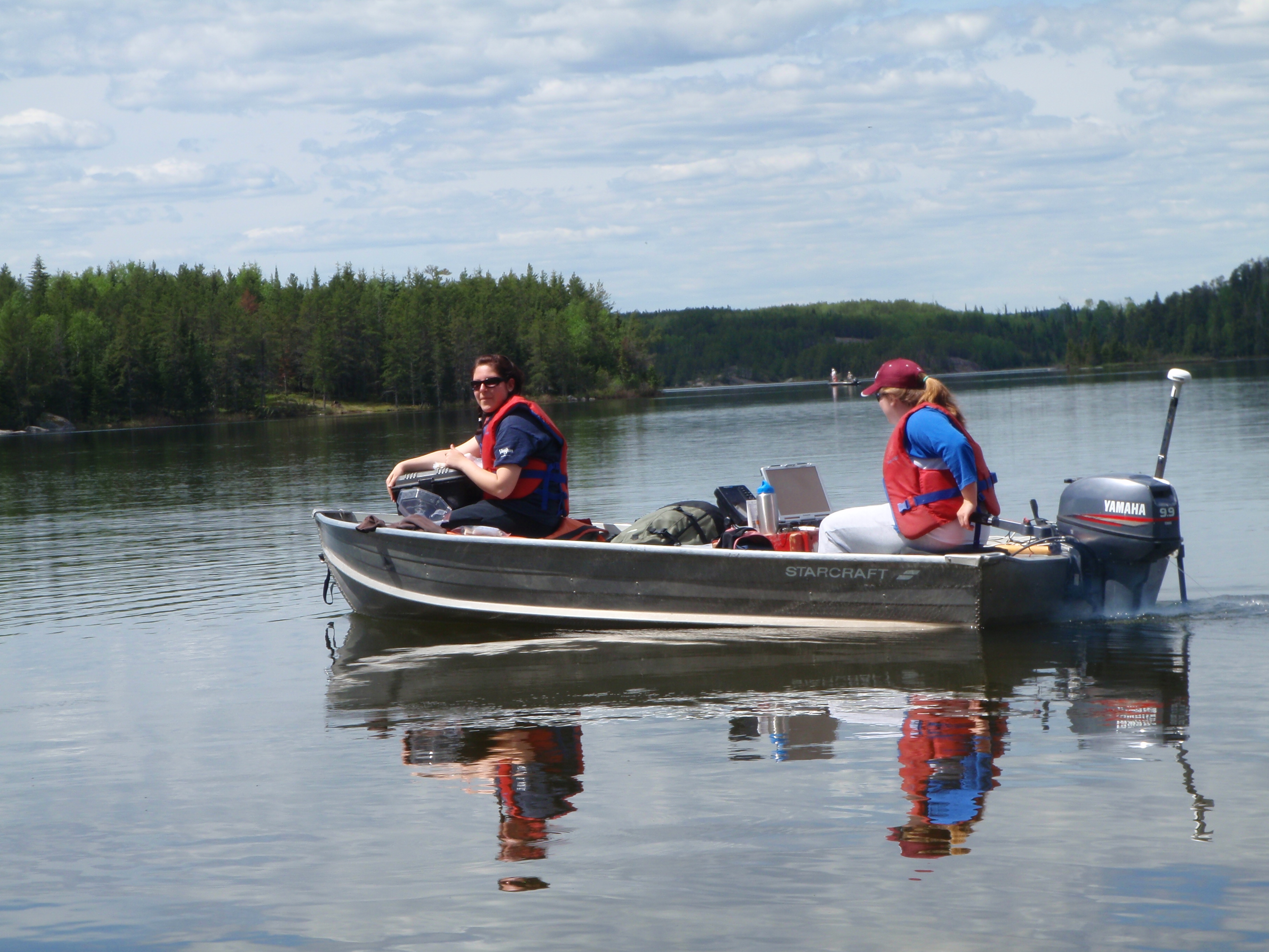 Depth profiles of limnological variables (pH, temperature, specific conductivity and dissolved oxygen) were collected from each of the lakes using the same methods as in field trip # 1. Secchi depth was recorded. In addition, water was collected using an integrated water sampler provided by the Ontario Ministry of the Environment.  A water sample was collected from the top 5 meters of the water column.  Two litres were collected from each lake for water analysis.  One litre of the water was filtered using 0.45µm mesh, and the other kept as a whole water sample.  The water samples were kept in a refrigerator or on ice for the duration of the trip in Nalgene or PET containers.  Upon return to Kingston, the samples were sent to Ontario Ministry of the Environment Dorset Environmental Science Centre in Dorset, ON where they were analyzed for all the major anions and cations, phosphorous, nitrogen, silica, and dissolved organic carbon. A detailed report of the field work and findings was produced (see Lewis et al. 2008).