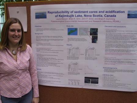 Laura's research addressed the question of reproducibility of sediment in a large (2640ha) lake (i.e., is one core representative of the whole lake?) and tracked the timing of changes related to acid deposition in Kejimkujik Lake, Kejimkujik National Park, N.S.
