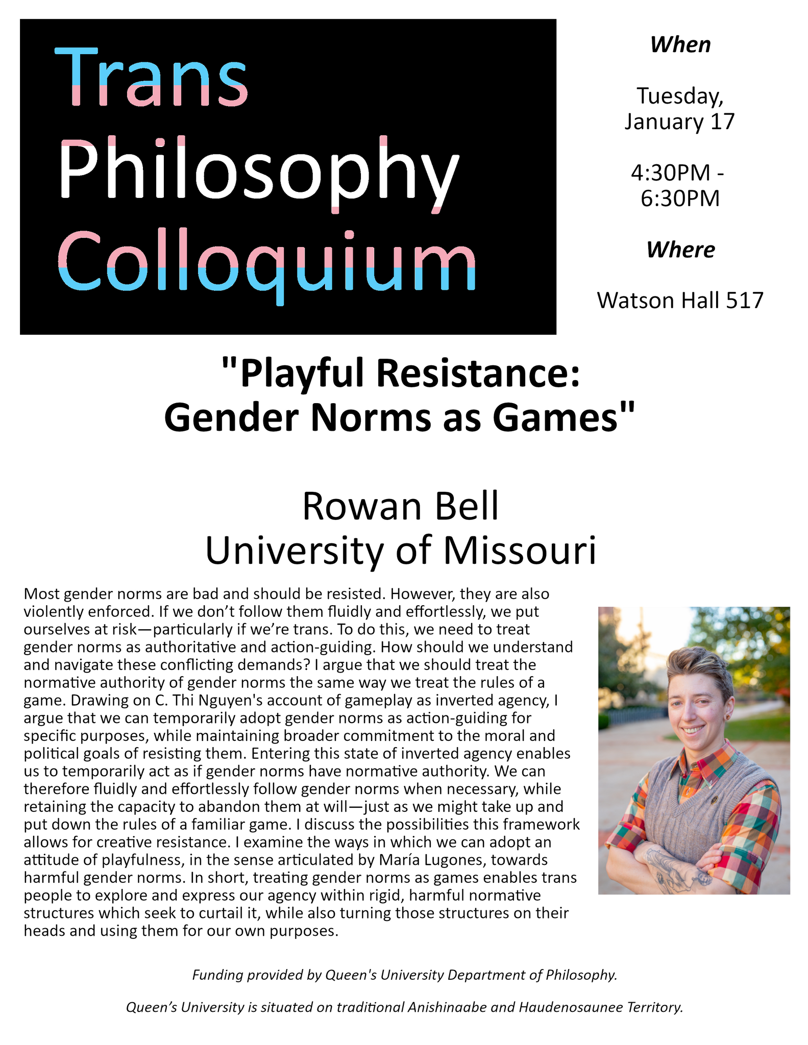 The Department of Philosophy is pleased to invite you to the first meeting of its Trans Philosophy Colloquium Series, which will welcome Rowan Bell (Missouri) to give a talk, titled, "Playful Resistance: Gender Norms as Games". The abstract can be found on the poster below.