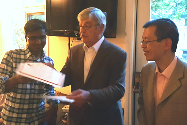 Sunny Bobbara receives his certificate as one of the recipients of the Malcolm Stott TA Award as award donor and founder, Bing Wang, looks on