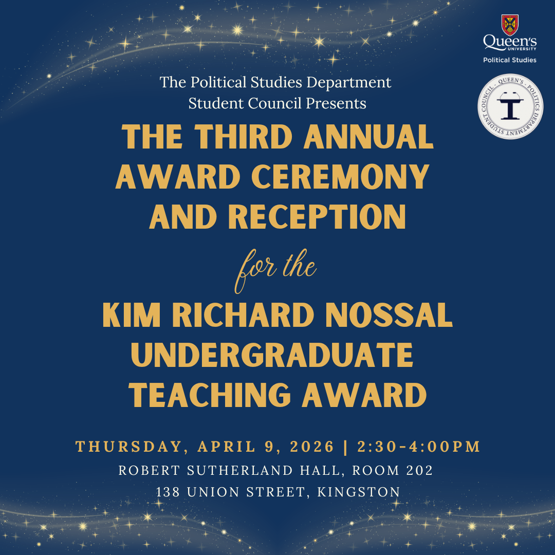 The Kim Richard Nossal Teaching Award is in recognition of Professor Emeritus Kim Richard Nossal and his legacy of commitment to higher education and teaching in Political Studies at Queen’s University.