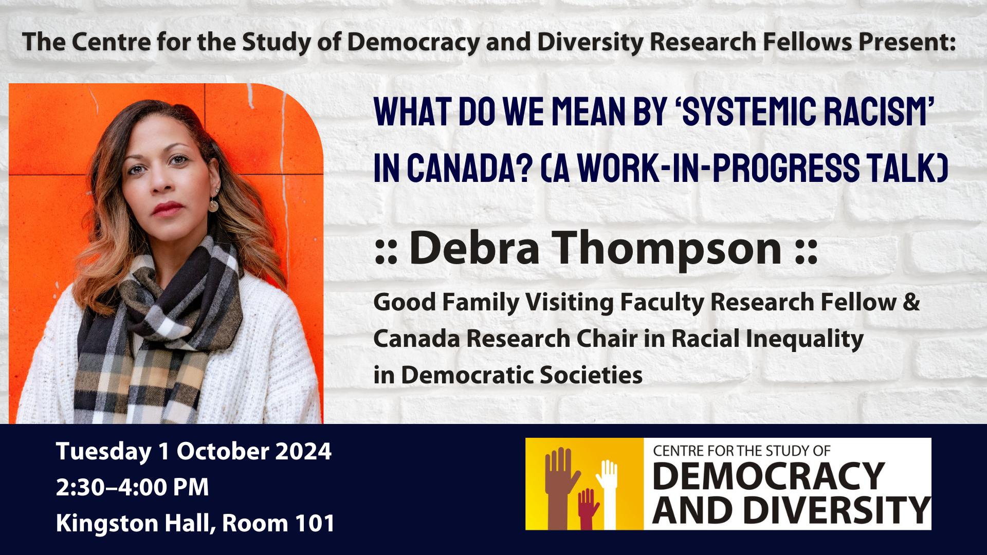The Centre for the Study of Democracy and Diversity (CSDD) is pleased to announce that Dr. Debra Thompson, an Associate Professor of Political Science and a Canada Research Chair in Racial Inequality in Democratic Societies at McGill University, is a Good Family Visiting Faculty Research Fellow with the CSDD during the 2024–25 academic year!