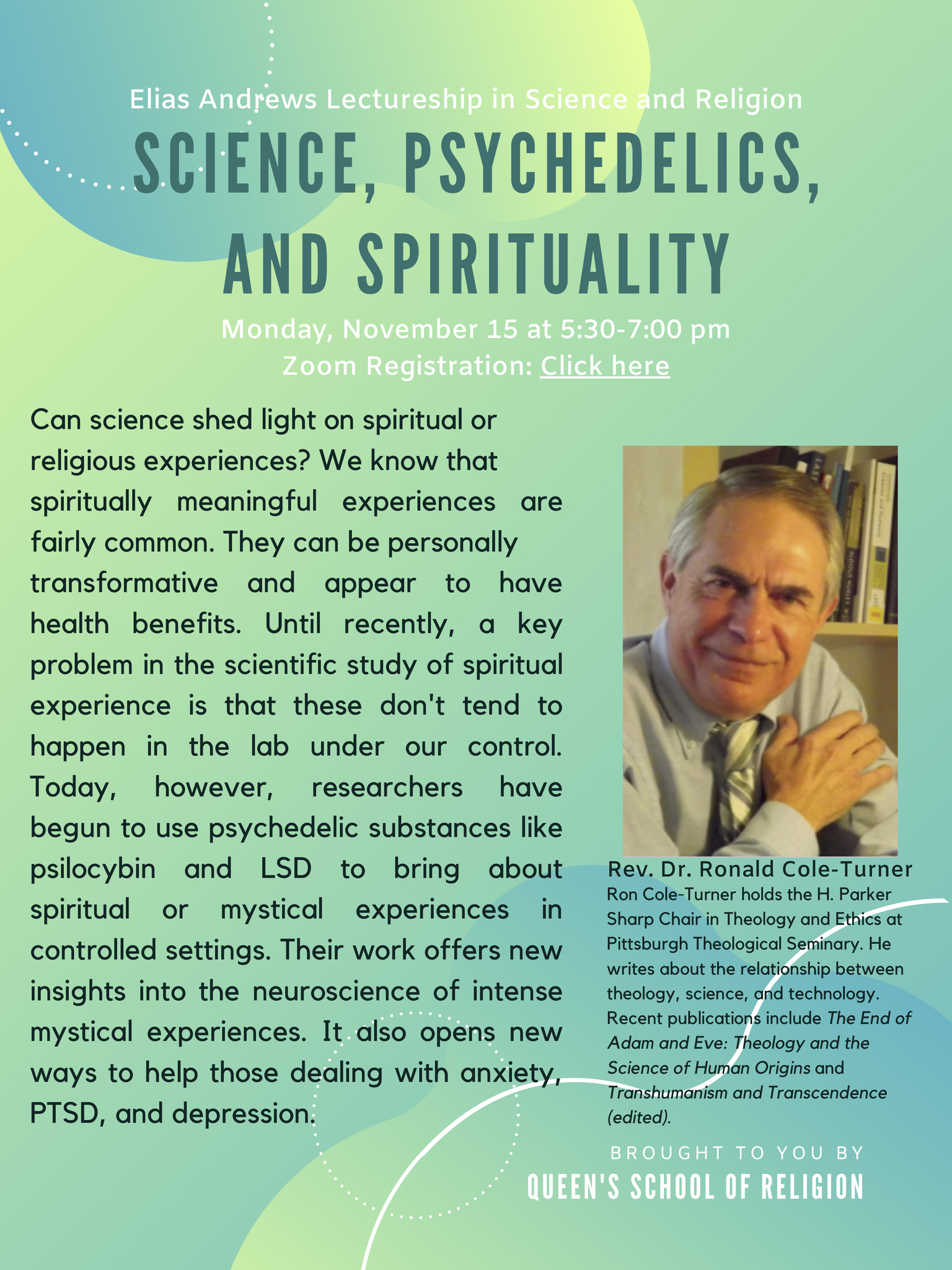 Science, Psychedelics, and Spirituality DateMonday November 15, 2021 5:30 pm - 7:00 pm Location The School of Religion is happy to present this year's Elias Andrews Lectureship in Science and Religion.