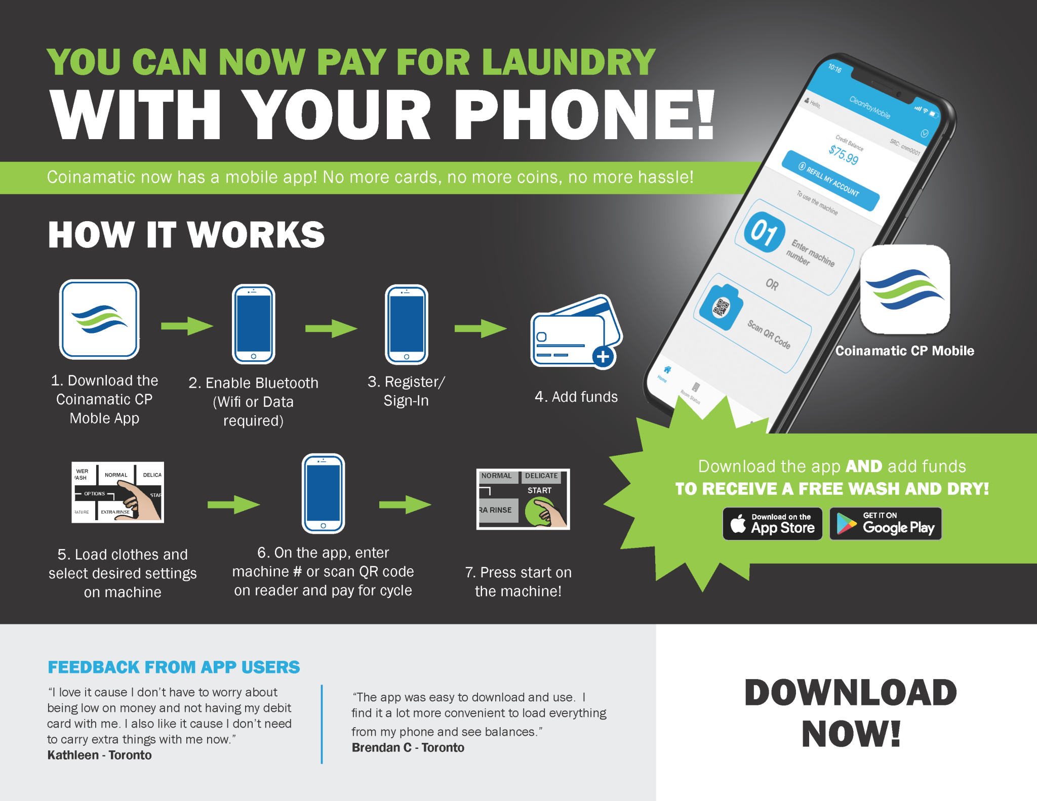 Looking for help using the Coinamatic app to do laundry? Watch this video.
