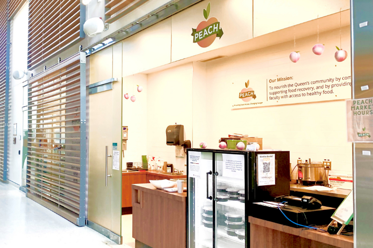 Queen's Providing Equal Access, Changing Hunger (PEACH) Market to combat food insecurity and support food recovery by providing students, staff, and faculty with access to healthy food. Untouched food is rescued from across Queen's Hospitality Services' locations and packaged daily for sale at a self-selecting, sliding scale model, or an open rate to allow customers to voluntarily pay whatever they are able. From May 2024 to April 2025, more than 6,500 meals were served.