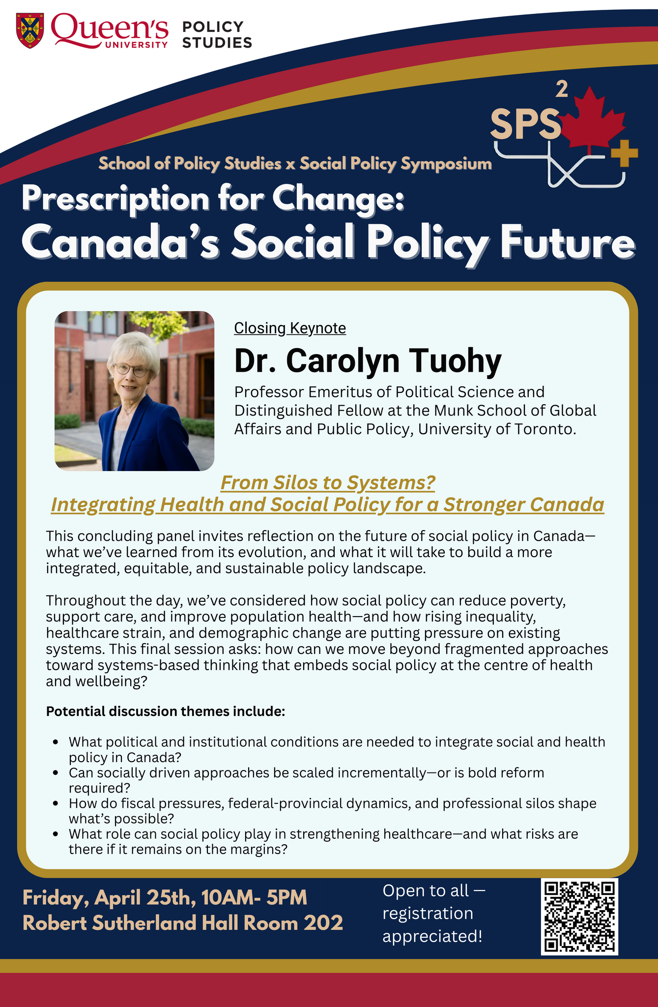Session #4/Closing Keynote: From Silos to Systems? Integrating Health and Social Policy for a Stronger Canada Closing Keynote Speaker: Carolyn Tuohy |