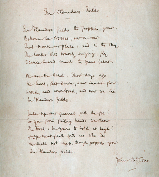 “In Flanders Fields” written in John McCrae’s own hand. Photo: McGill Osler Library