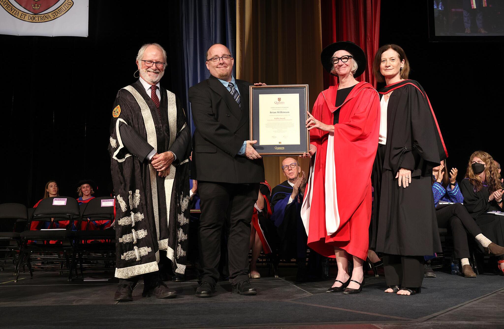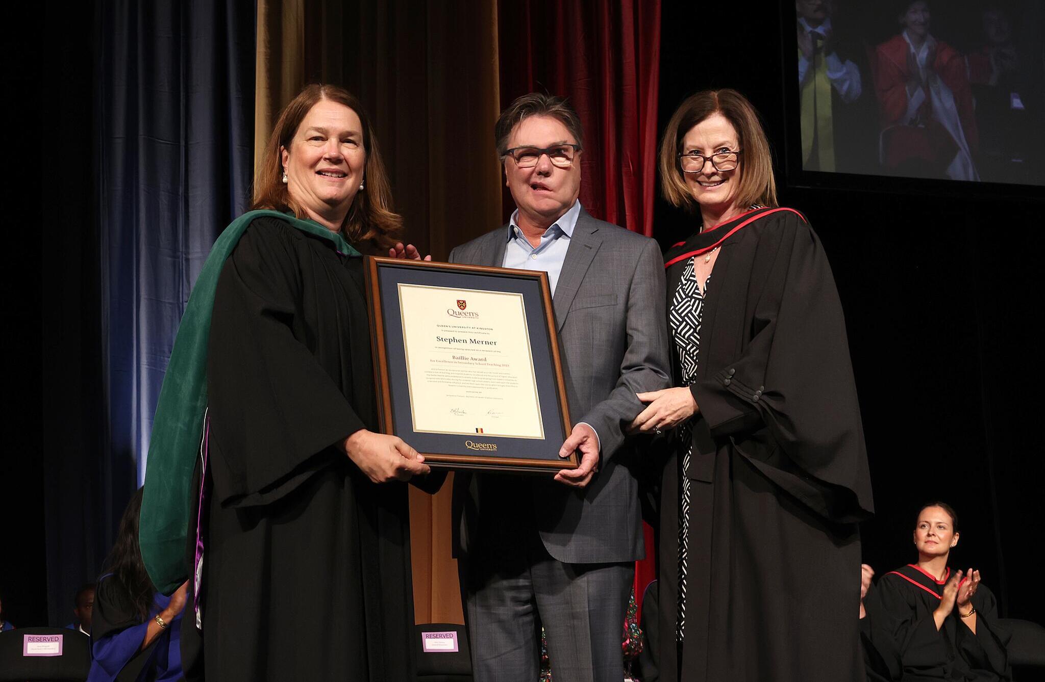Baillie Award recipient Paul Nalli on stage at the Spring 2025 convocation with (from left to right) Rector Niki Boytchuk-Hale, Chancellor Shelagh Rogers, Baillie Award nominator Alisa Robinson, Principal and Vice-Chancellor Patrick Deane, and Interim Vice-Provost & Dean of Student Affairs Corinna Fitzgerald.