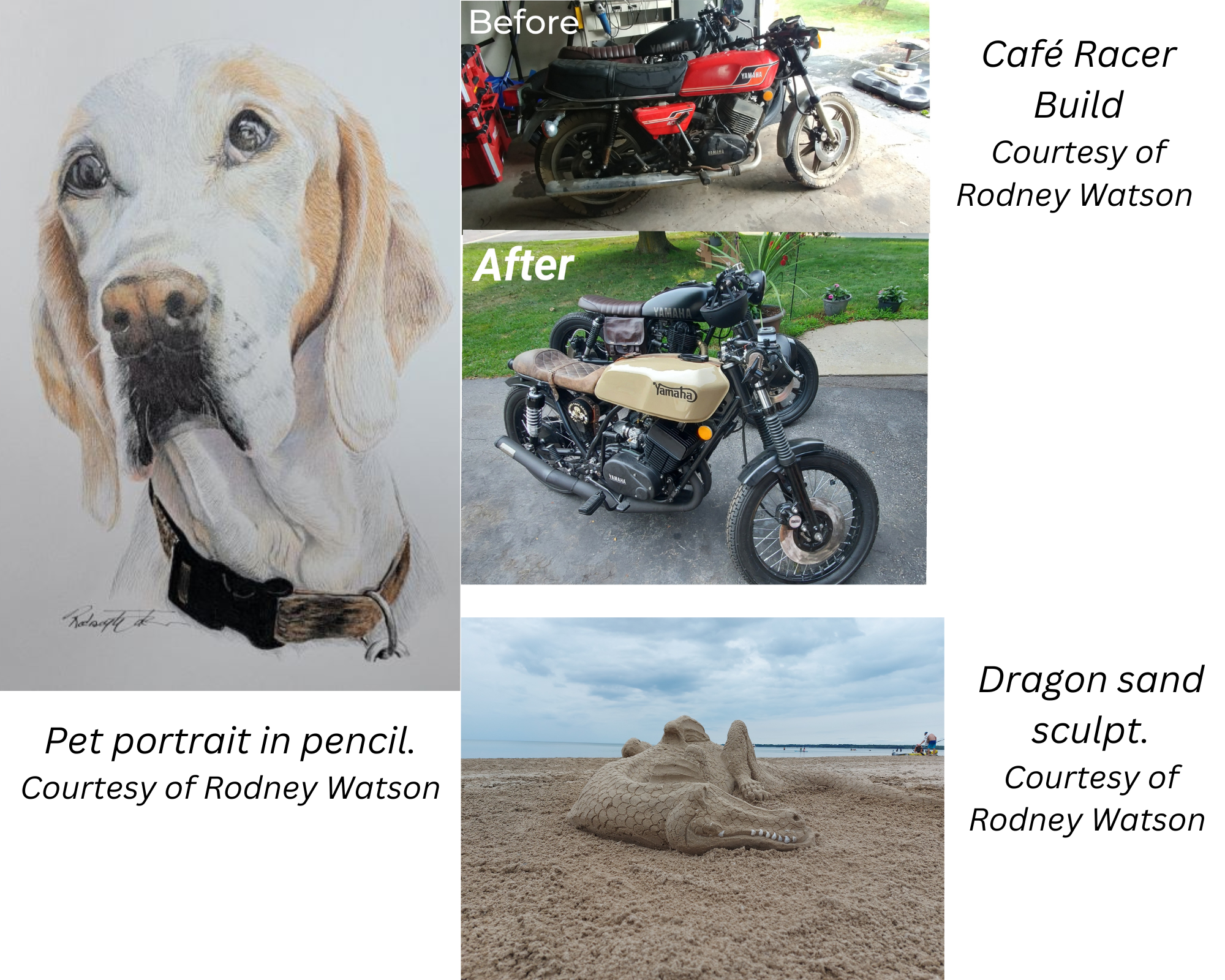 I have a few sand sculpting gigs lined up for this summer and will again compete in this year's sidewalk chalk competition downtown Kingston. I have more paintings to complete for a store in Prince Edward Island. I’m still working on 36 new drawings that I took on in November 2022. I am currently working on a new technique that I want to keep under wraps and plan to focus on it after I am done with my pet portrait commissions. As for the Café Racer, I think two bikes will be enough. Maybe!