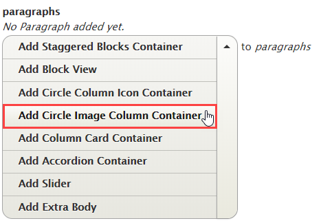 - Scroll down to the Paragraphs section, click the drop-down arrow, and click "Add Circle Image Column Container".