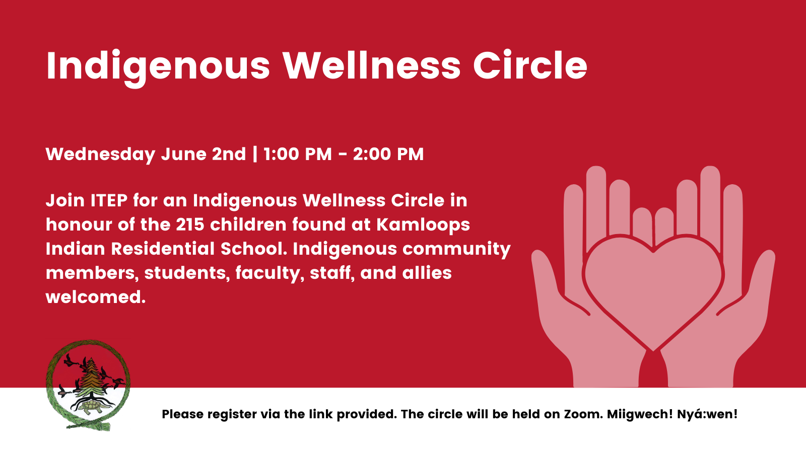In honour of the 215 children found at Kamloops Indian Residential School in British Columbia, Deb and I will be hosting an Indigenous Wellness Circle for those who are grieving these losses and would like a space for discussion and community. This circle is open to Indigenous community members, faculty, staff, students, and allies who would like to attend. The circle will be on Wednesday, June 2nd at 1:00 PM.